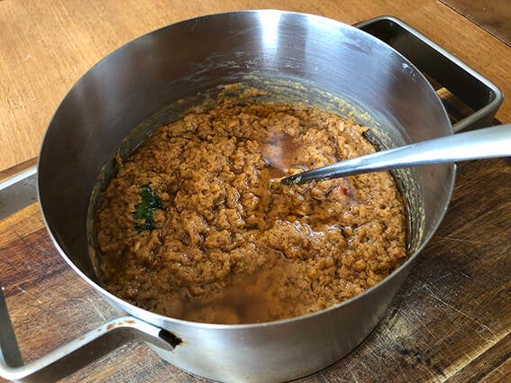 - Voeg een halve pot pindakaas toe en even goed los roeren.